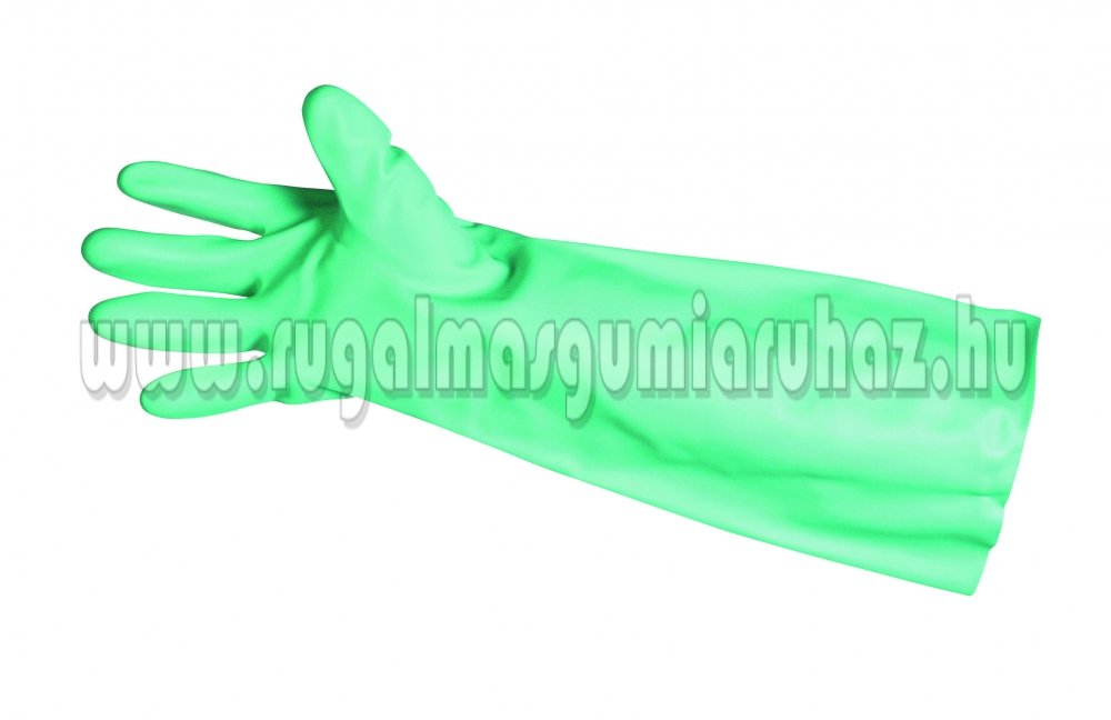 0,56 mm vastag nitrilből készült zöld antisztatikus kesztyű textúrált tenyér- és ujjfelülettel. Teljes hossza: 45,5 cm.