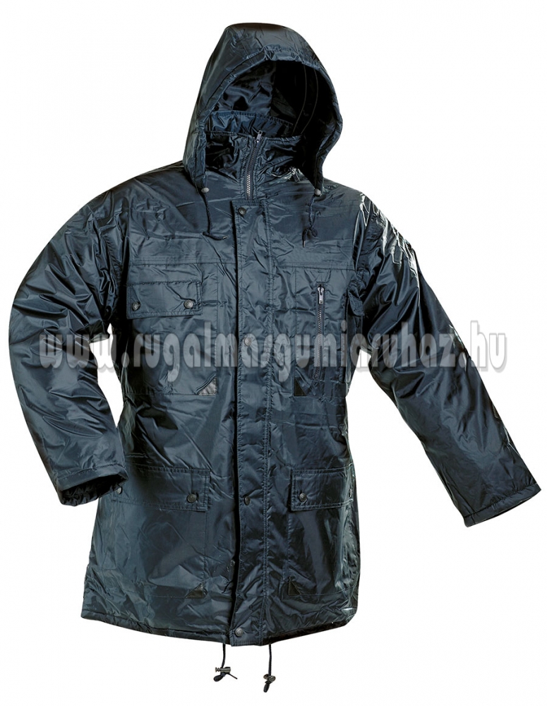 Meleg bélésű, vízhatlan, kapucnis dzseki megerősített varrással.