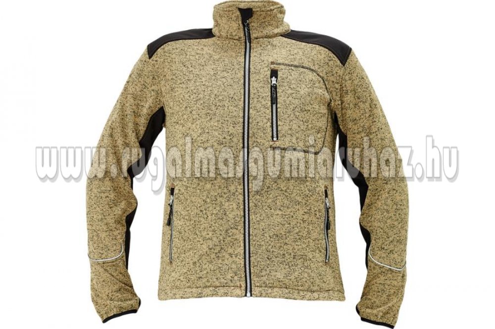 Férfi cipzáras kardigán kötött, melírozott textilből; belül fésült, puha felület; kontrasztos softshell erősítésekkel a vállakon és az ujjakon; 1 cipzáras mellzseb; 2 cipzáras oldalzseb; a kabát alja zsinórral szűkíthető; dekoratív fényvisszavető szegély; hüvelykujj bújtató