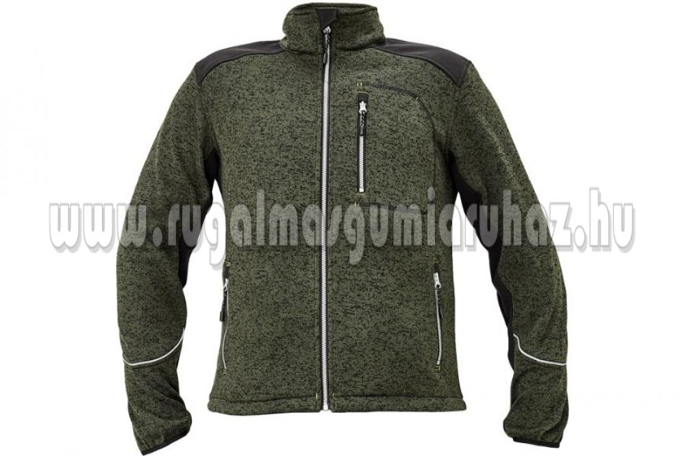 Férfi cipzáras kardigán kötött, melírozott textilből; belül fésült, puha felület; kontrasztos softshell erősítésekkel a vállakon és az ujjakon; 1 cipzáras mellzseb; 2 cipzáras oldalzseb; a kabát alja zsinórral szűkíthető; dekoratív fényvisszavető szegély; hüvelykujj bújtató