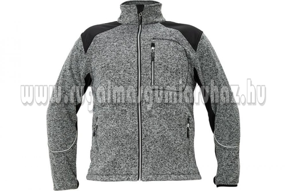 Férfi cipzáras kardigán kötött, melírozott textilből; belül fésült, puha felület; kontrasztos softshell erősítésekkel a vállakon és az ujjakon; 1 cipzáras mellzseb; 2 cipzáras oldalzseb; a kabát alja zsinórral szűkíthető; dekoratív fényvisszavető szegély; hüvelykujj bújtató