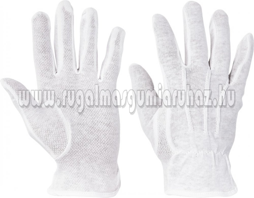 Kötött pamutkelméből varrt, mandzsetta nélküli kesztyű PVC-vel pontozott tenyérrel és ujjakkal, valamint rugalmas szalaggal a csukló felső részén.