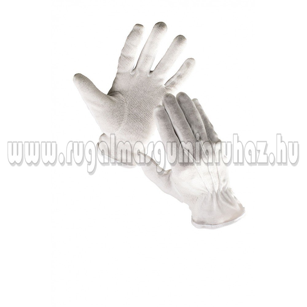 Kötött pamutkelméből varrt, mandzsetta nélküli kesztyű PVC-vel pontozott tenyérrel és ujjakkal, valamint rugalmas szalaggal a csukló felső részén. 1 csomagban 12 pár kesztyű található.