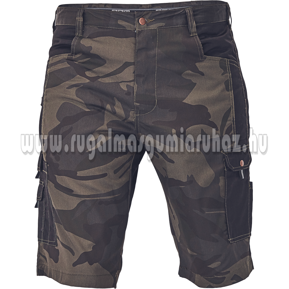 Könnyű férfi rövidnadrág, 190g/m2 kevert szálas sávoly szövetből. Funkcionális zsebekkel: 2 oldalt, 2 cargo, 2 farzseb. Terepmintás anyagból.