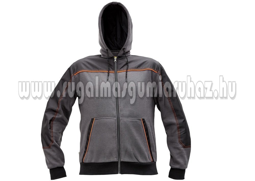férfi zipzáras kapucnis kardigán; puha tapintású, belül fésült felületű anyagból; 2 elülső kenguruzseb; váll- és könyökrészek Oxford erősítéssel; elasztikus passzé az ujjakon és pulóver alján; hurkok, melyekkel csatlakoztatható a CREMORNE télikabáthoz