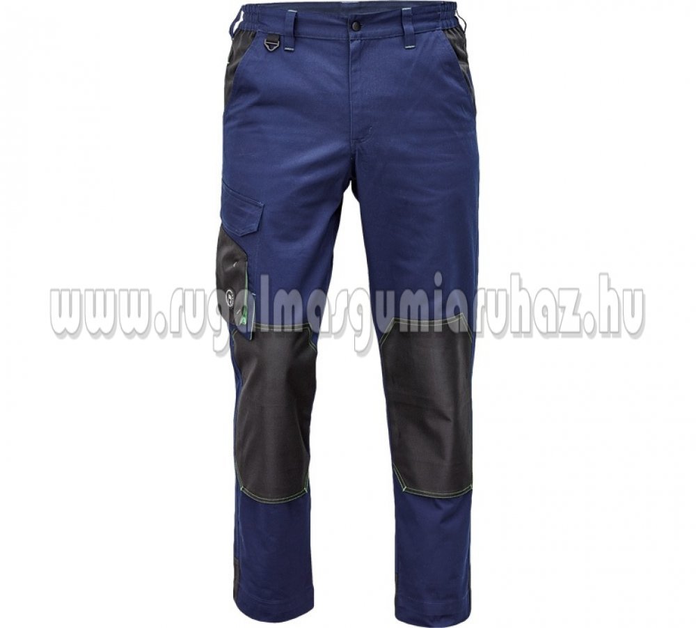 férfi munkanadrág pamutgazdag anyagból; modern szabás; megerősített térdrész, térdvédőtartó zsebbel; 2 oldalsó zseb; 1 többfunkciós zseb; tépőzáras hátsózseb; rugalmas derék; D-gyűrű; hosszabbítható szár