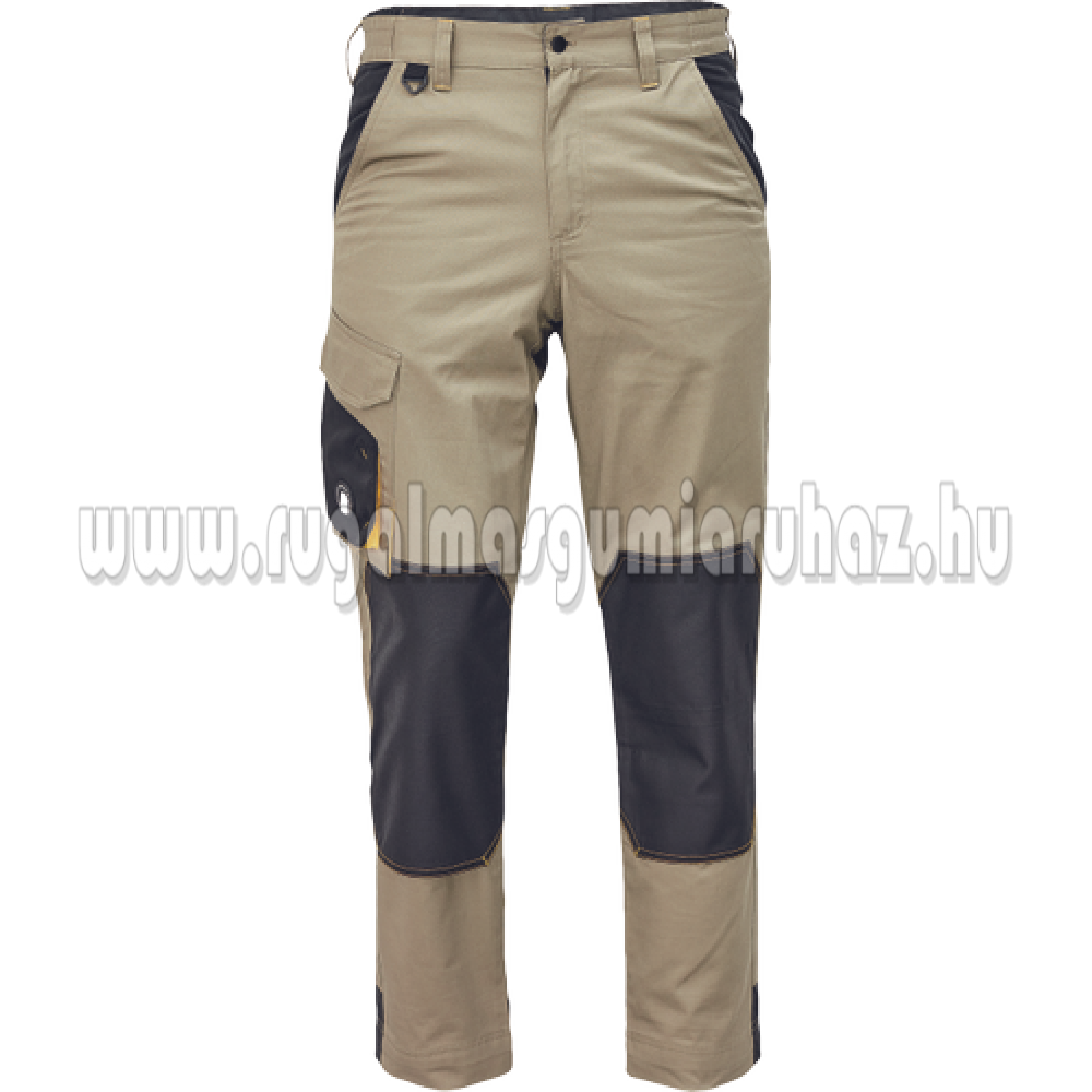 férfi munkanadrág pamutgazdag anyagból; modern szabás; megerősített térdrész, térdvédőtartó zsebbel; 2 oldalsó zseb; 1 többfunkciós zseb; tépőzáras hátsózseb; rugalmas derék; D-gyűrű; hosszabbítható szár