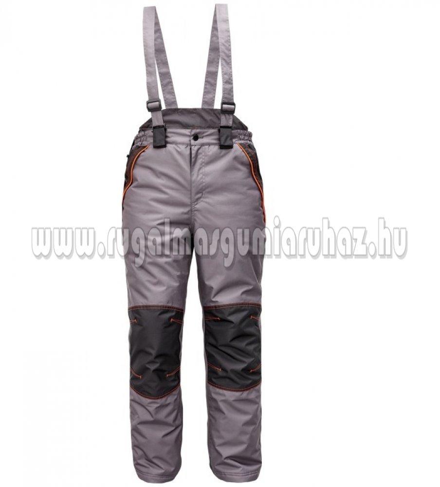 férfi téli bélelt nadrág, levehető kantárral; a térdrészek és a szárak hátsó alsó részei erősítettek; 2 oldalsó zipzáras zseb; 1 hátsó zipzáras zseb