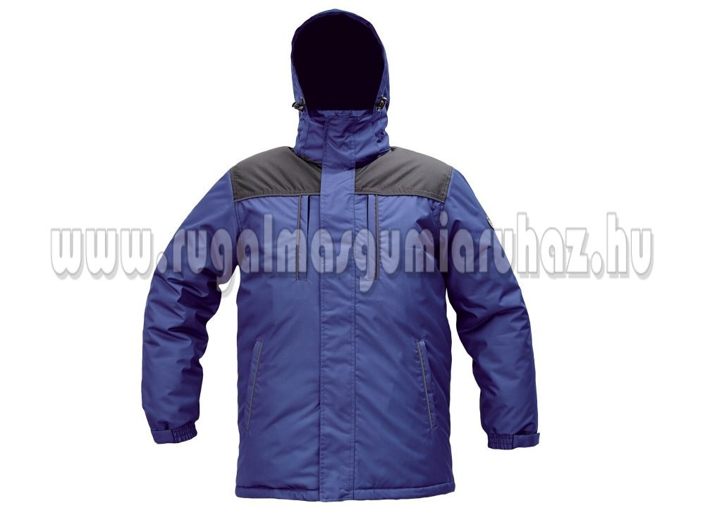 férfi kapucnis télikabát; hosszított hátsórész; 2 mellkasi zipzáras zseb; 2 oldalsó zipzáras zseb; 1 belső zseb tépőzárral; húzózsinór a kabát alján; polár bélésű gallér; a csukló tépőzárral állítható
