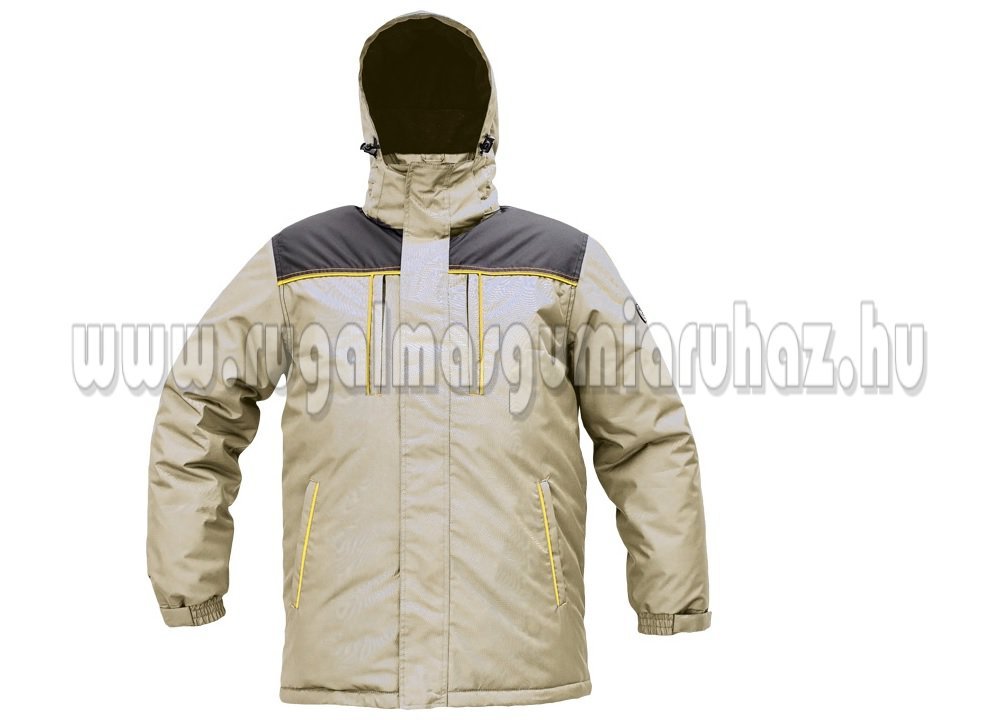 férfi kapucnis télikabát; hosszított hátsórész; 2 mellkasi zipzáras zseb; 2 oldalsó zipzáras zseb; 1 belső zseb tépőzárral; húzózsinór a kabát alján; polár bélésű gallér; a csukló tépőzárral állítható