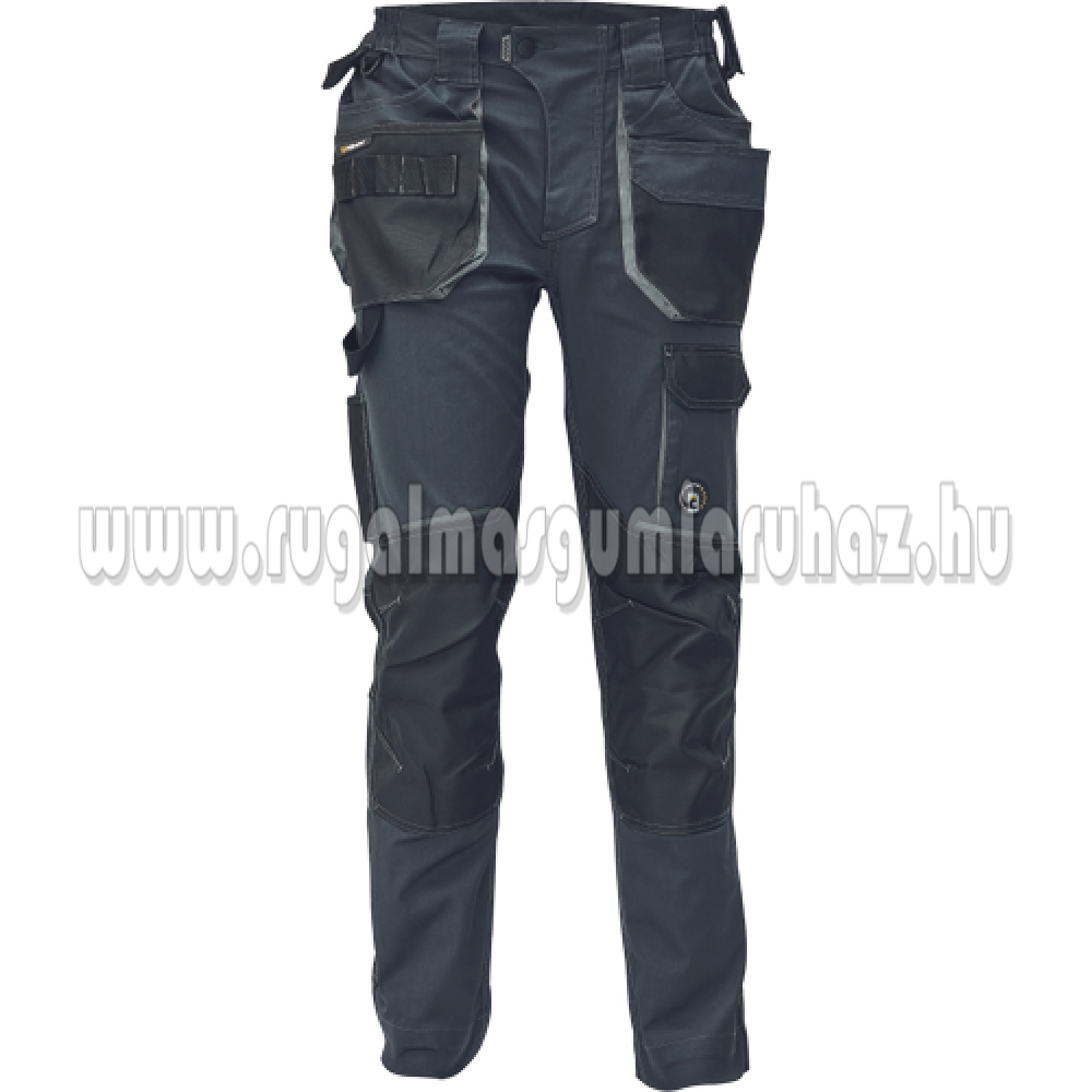 Férfi munkanadrág; rugalmas, innovatív szövet TRIFIBETEX - ergonomikus szabás; alacsony gumírozott derék; tartós tripla varrások a lábaknál és az ágyéknál; megerősített térdrész, térdvédőtartó zsebbel; tágas multifunkcionális első zsebek szerszámtartó pánttal; 2 hátsó zseb Oxford erősítéssel; a combon telefontartó zseb tépőzáras fedéllel; vonalzó zseb; késtartó zseb; kalapácstartó; D-gyűrű; szerszámtartó hurok a derékon; egyedi kivitelű repülőzseb; fényvisszavető kiegészítések; hosszabbítható szár