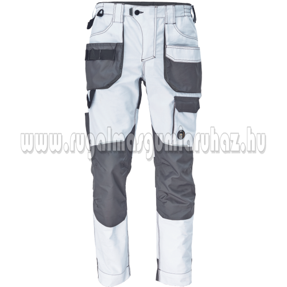 Férfi munkanadrág; rugalmas, innovatív szövet TRIFIBETEX - ergonomikus szabás; alacsony gumírozott derék; tartós tripla varrások a lábaknál és az ágyéknál; megerősített térdrész, térdvédőtartó zsebbel; tágas multifunkcionális első zsebek szerszámtartó pánttal; 2 hátsó zseb Oxford erősítéssel; a combon telefontartó zseb tépőzáras fedéllel; vonalzó zseb; késtartó zseb; kalapácstartó; D-gyűrű; szerszámtartó hurok a derékon; egyedi kivitelű repülőzseb; fényvisszavető kiegészítések; hosszabbítható szár