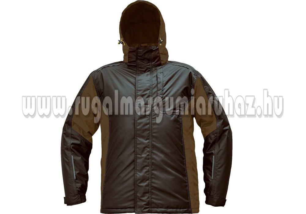 Férfi téli kabát levehető kapucnival; hosszított hátsó rész; 1 mellkasi zipzáras zseb; 2 oldalsó zipzáras zseb; 2 belső zipzáras zseb; tépőzáras borítás zipzáron; a kapucni húzózsinórral állítható; polár gallér és kapucni; rugalmas passzé az ujjakon és az deréknál; hímezhető hátrész; fényvisszavető kiegészítések