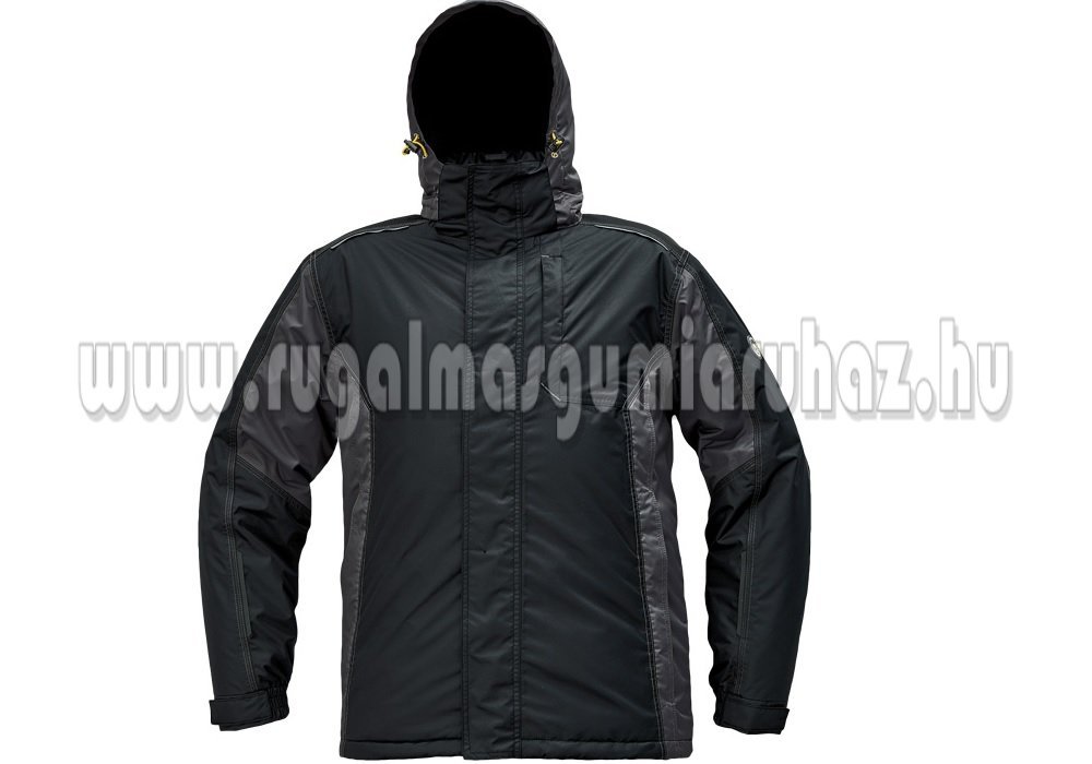 Férfi téli kabát levehető kapucnival; hosszított hátsó rész; 1 mellkasi zipzáras zseb; 2 oldalsó zipzáras zseb; 2 belső zipzáras zseb; tépőzáras borítás zipzáron; a kapucni húzózsinórral állítható; polár gallér és kapucni; rugalmas passzé az ujjakon és az deréknál; hímezhető hátrész; fényvisszavető kiegészítések