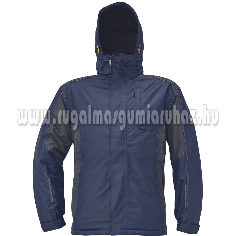 Férfi téli kabát levehető kapucnival; hosszított hátsó rész; 1 mellkasi zipzáras zseb; 2 oldalsó zipzáras zseb; 2 belső zipzáras zseb; tépőzáras borítás zipzáron; a kapucni húzózsinórral állítható; polár gallér és kapucni; rugalmas passzé az ujjakon és az deréknál; hímezhető hátrész; fényvisszavető kiegészítések