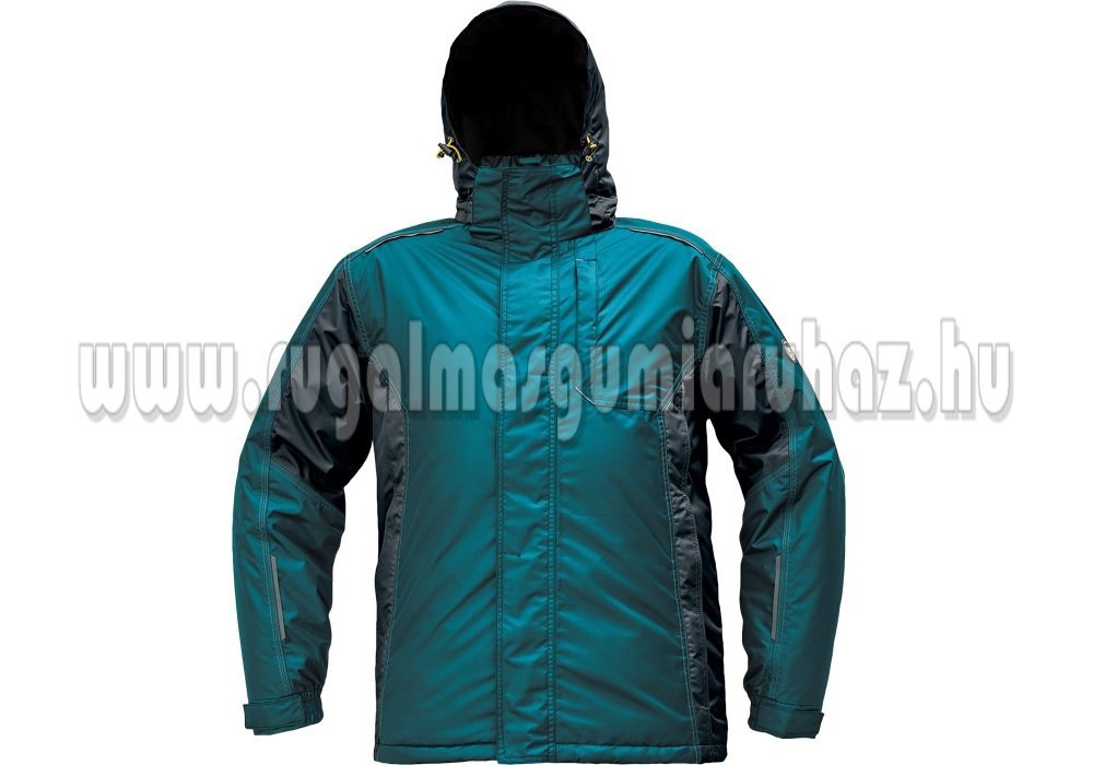 Férfi téli kabát levehető kapucnival; hosszított hátsó rész; 1 mellkasi zipzáras zseb; 2 oldalsó zipzáras zseb; 2 belső zipzáras zseb; tépőzáras borítás zipzáron; a kapucni húzózsinórral állítható; polár gallér és kapucni; rugalmas passzé az ujjakon és az deréknál; hímezhető hátrész; fényvisszavető kiegészítések