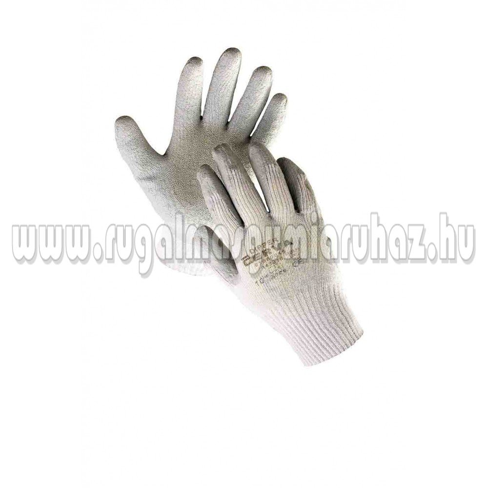 Pamut/poliészter keverékből készült, természetes latexbe félig mártott, kötött, varratmentes kesztyű csúszásgátló kikészítésű tenyérrel és ujjakkal, valamint rugalmas kötött mandzsettával. Méretek: a női 8 (zöld), a férfi 10 (szürke). 1 csomagban 12 pár kesztyű található.