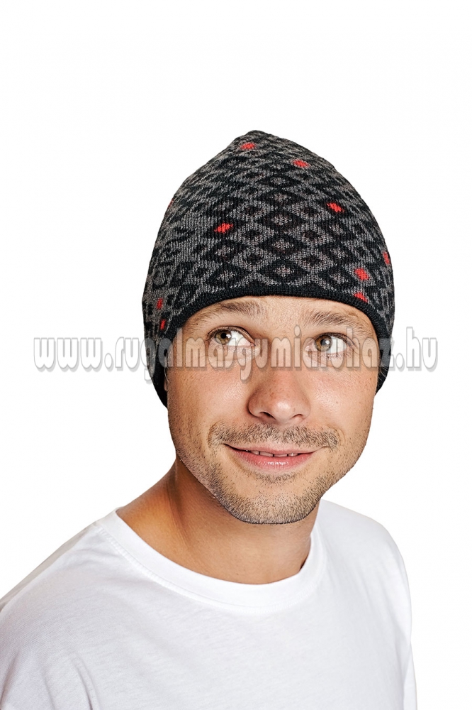 Kötött sapka modern mintával, megerősített szélálló réteggel.