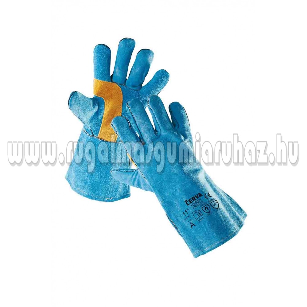 35 cm hosszú, hasított marhabőrből készült, pamut bélésű kesztyű erősített tenyérrésszel és fedett varratokkal. Tanúsítvány: hegesztés - A típus