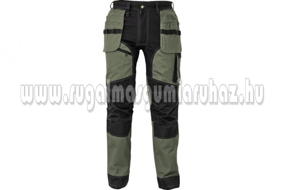 Férfi munkanadrág rugalmas derékkal; 2 oldalsó zseb, két szerszámtartó zsebbel elöl; D-gyűrű; 1 oldalsó zseb a lábon hajtókával; 1 oldalsó zseb cipzárral; 2 hátsó hajtókás zseb; megerősített térdrész, térdvédőtartó; 5 cm-rel meghosszabbítható nadrágszárak; a nadrág hátsó, alsó része megerősített; dekoratív varratok; 265 g/m2
