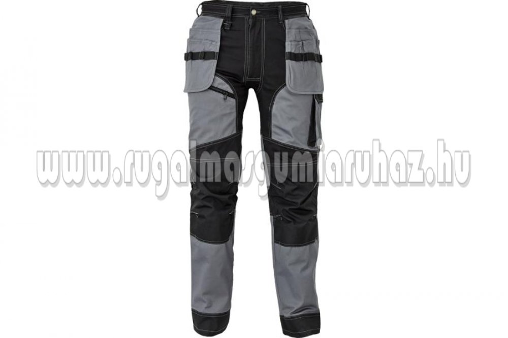 Férfi munkanadrág rugalmas derékkal; 2 oldalsó zseb, két szerszámtartó zsebbel elöl; D-gyűrű; 1 oldalsó zseb a lábon hajtókával; 1 oldalsó zseb cipzárral; 2 hátsó hajtókás zseb; megerősített térdrész, térdvédőtartó; 5 cm-rel meghosszabbítható nadrágszárak; a nadrág hátsó, alsó része megerősített; dekoratív varratok; 265 g/m2
