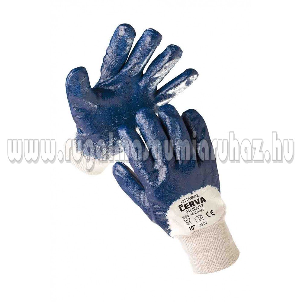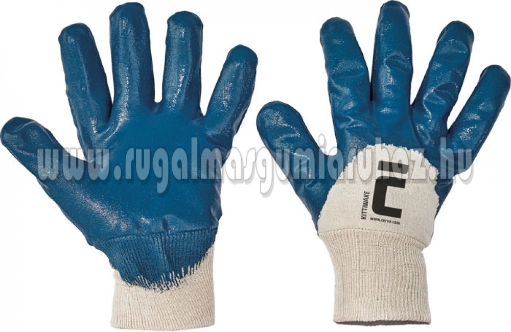 Kötött pamutkelméből varrt, nitrilbe félig mártott kék kesztyű rugalmas mandzsettával. 1 csomagban 12 pár kesztyű található.