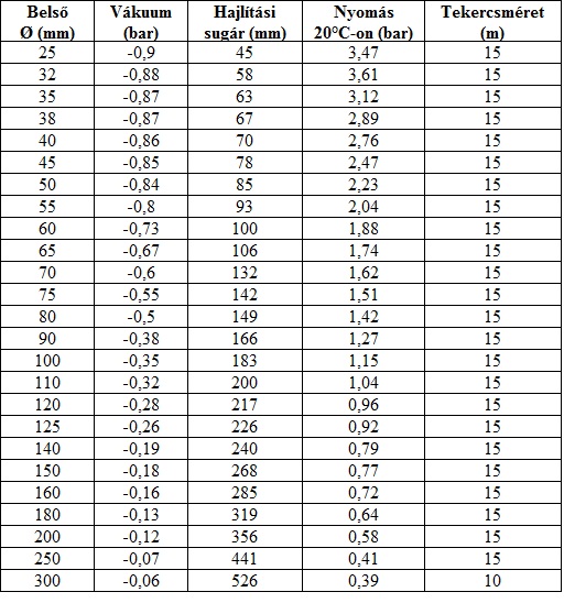 Hőállóság: -40°C/+100°C rövid ideig + 125°C. Nyomás 20°C-on: lásd táblázat. Hajlítási sugár: 1,5 x belsõ Ø. Falvastagság: 1,4 mm a spirálok között.