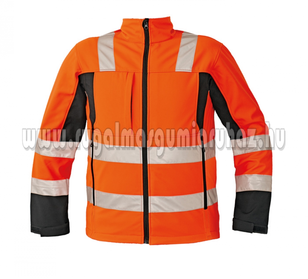 Láthatósági softshell kabát két oldalzsebbel, mell zseb cipzárral, alsó szegélyben húzózsinórral. Anyaga: 75D PES zsávoly/TPU/HV polár, 290g/m2.