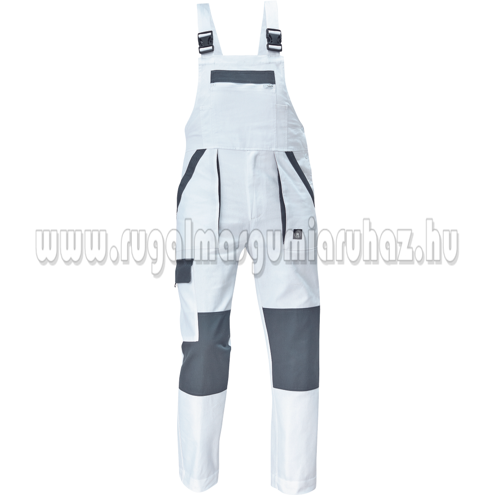 Férfi mellesnadrág rugalmas derékkal, széles pántokkal, műanyag csatokkal; 2 első zseb, 1 oldalzseb, 1 nagy mellzseb, 2 hátsó zseb; megerősített térdrész; a szárak hossza meghosszabbítható; anyag: 100% pamut, anyagvastagság: 260 g/m86