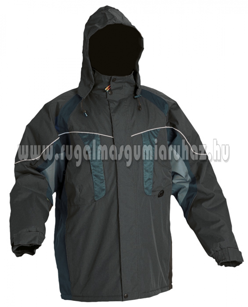 Vízhatlan, meleg bélésű dzseki gallérba rejthető kapucnival.
