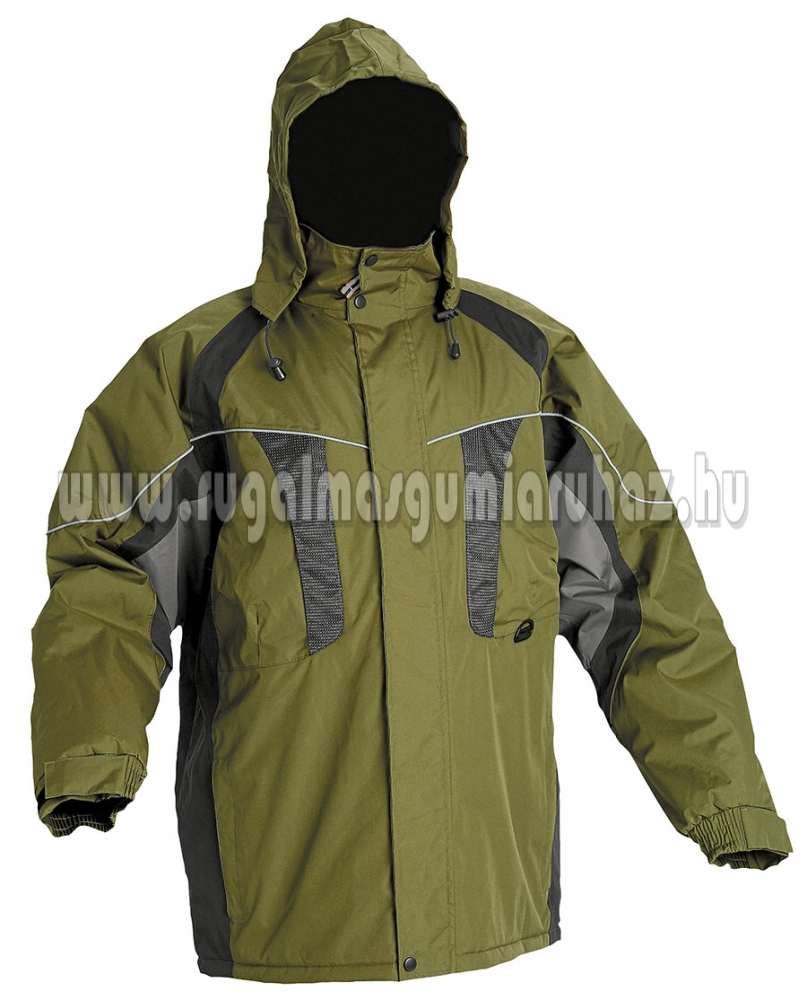 Vízhatlan, meleg bélésű dzseki gallérba rejthető kapucnival.