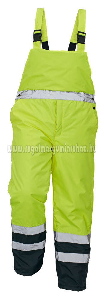 Vízálló, melegen bélelt jólláthatósági kantáros nadrág, megfelel az EN 471 szabványnak.