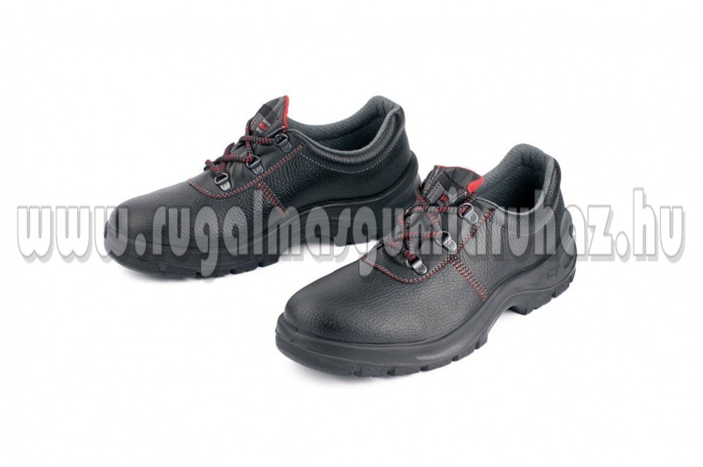 Biztonsági félcipő acél orrmerevítővel, antisztatikus, csúszásgátló és üzemanyagálló talppal, energiaelnyelő sarokrésszel és lélegző bőrből készült felsőrésszel.