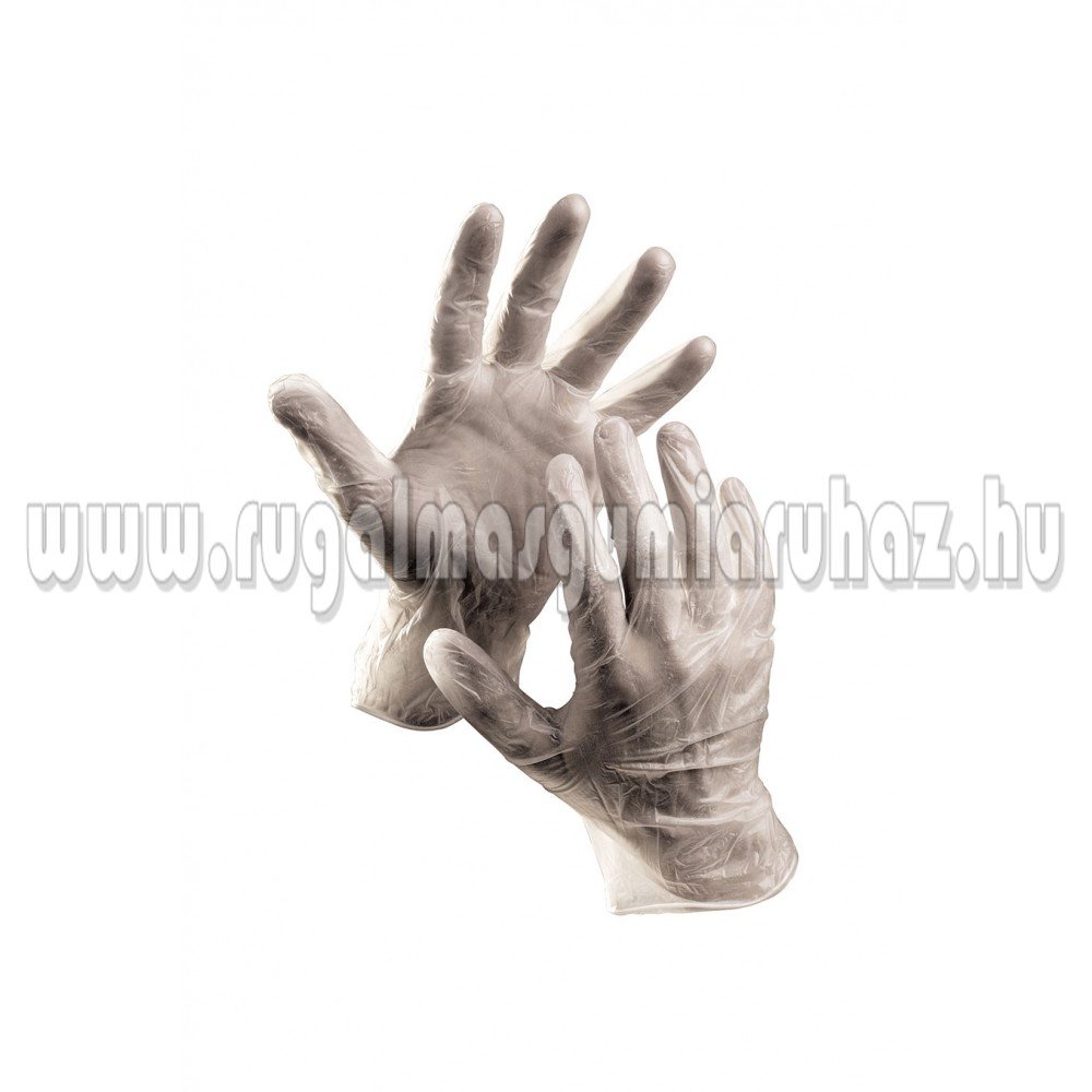 Nem zsíros élelmiszerekkel való rövid idejű érintkezésre alkalmas, egyszer használatos, púderezett vinil kesztyű. 100 db/doboz