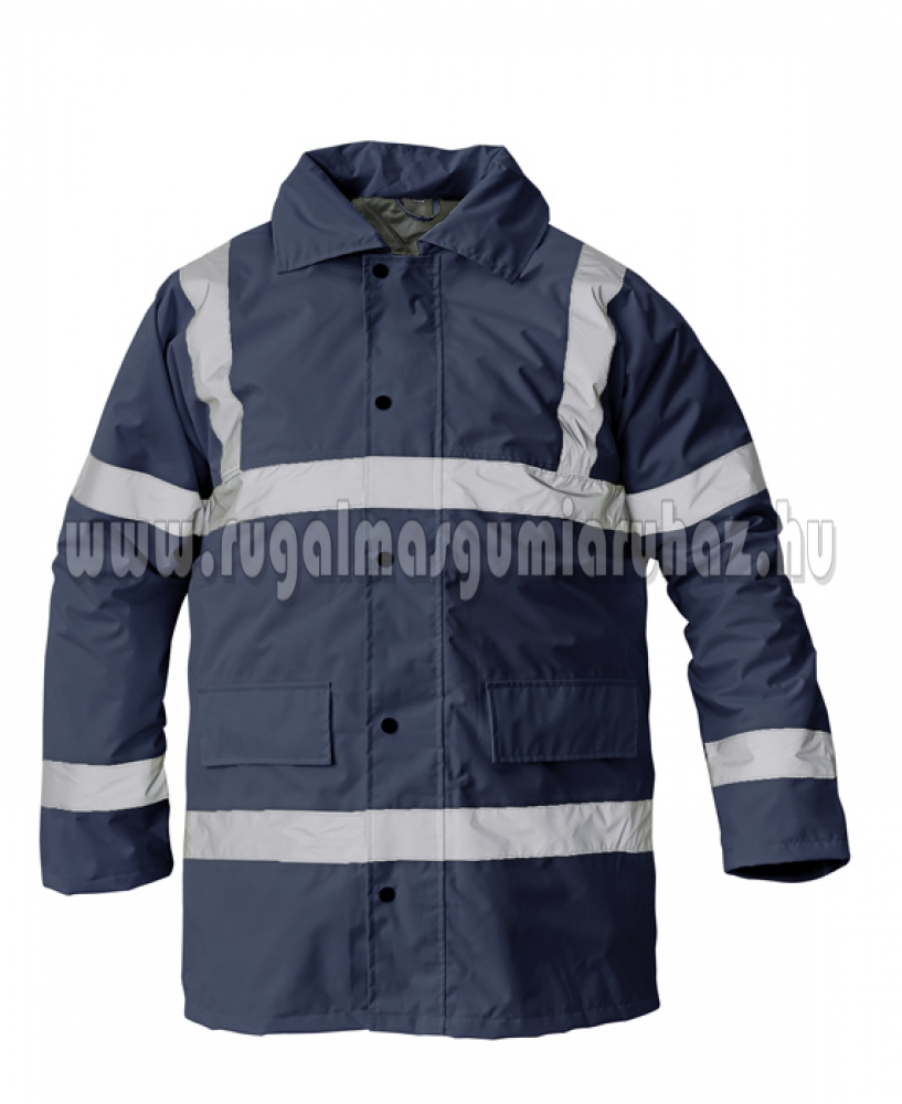 Bélelt és vízhatlan jólláthatósági dzseki az EN 471 szabványnak megfelelő láthatósággal, páraáteresztő PU réteggel, gallérba rejtett kapucnival, az EN 343 szabvány szerinti 3. osztályú vízállósággal és az EN 343 szabvány szerinti 1. osztályú páraáteresztő képességgel.