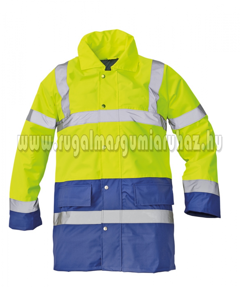 Bélelt és vízhatlan jólláthatósági dzseki az EN 471 szabványnak megfelelő láthatósággal, páraáteresztő PU réteggel, gallérba rejtett kapucnival, az EN 343 szabvány szerinti 3. osztályú vízállósággal és az EN 343 szabvány szerinti 1. osztályú páraáteresztő képességgel.