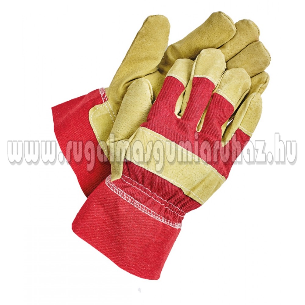 Hasított sertésbőr tenyerű, valamint fehér pamutszövet kézhátú és mandzsettájú melegen bélelt kesztyű. 1 csomagban 12 pár kesztyű található.