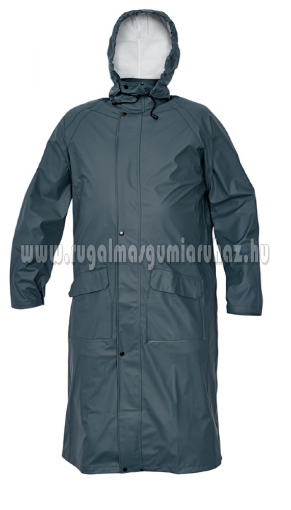 Vízálló 3-es kabát gallérba rejtett kapucnival, 120 cm hosszú, vízoszlop magasság 2000 mm. Fedett cipzárral és és fedett zsebbel. Könnyű, szakadásmentes, kellemes érintésű és rugalmas alapanyag.