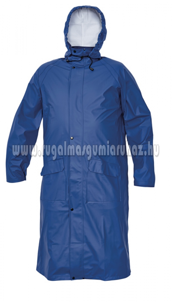Vízálló 3-es kabát gallérba rejtett kapucnival, 120 cm hosszú, vízoszlop magasság 2000 mm. Fedett cipzárral és és fedett zsebbel. Könnyű, szakadásmentes, kellemes érintésű és rugalmas alapanyag.