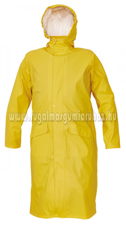 Vízálló 3-es kabát gallérba rejtett kapucnival, 120 cm hosszú, vízoszlop magasság 2000 mm. Fedett cipzárral és és fedett zsebbel. Könnyű, szakadásmentes, kellemes érintésű és rugalmas alapanyag.