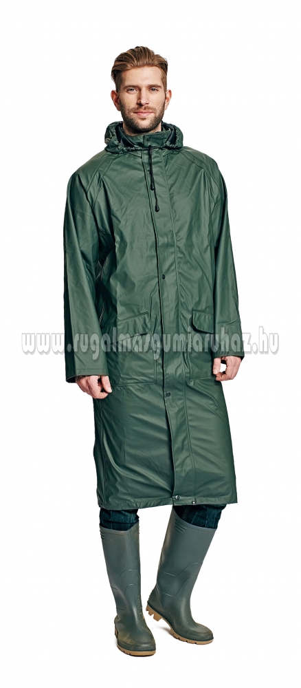 Vízálló 3-es kabát gallérba rejtett kapucnival, 120 cm hosszú, vízoszlop magasság 2000 mm. Fedett cipzárral és és fedett zsebbel. Könnyű, szakadásmentes, kellemes érintésű és rugalmas alapanyag.