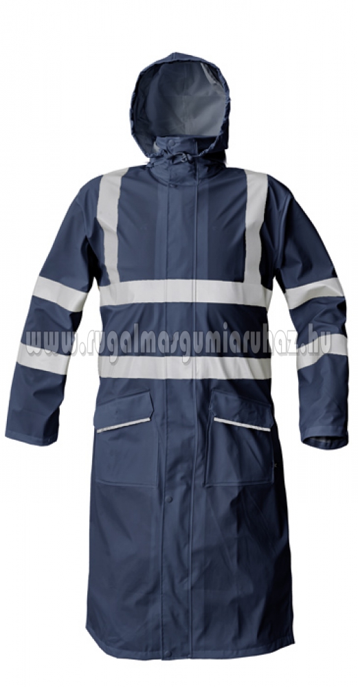 Vízálló és szélálló bőszabású esőkabát gallérba hajtott kapucnival, 120 cm hosszú, zsinórral megköthető kapucnival, kettő széles mellső zseb hajtókával védve a víz bejutásától, az ujján patenttal állítható.