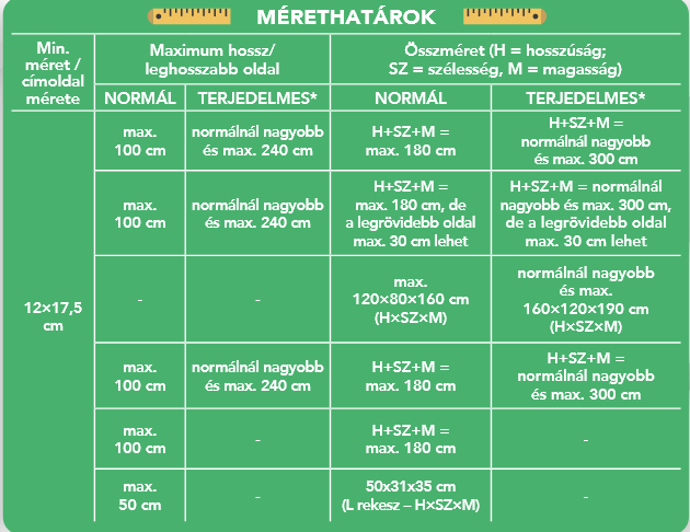 Postával történő kézbesítés esetén, ha terjedelmes a csomag, extra díj kerül felszámításra. A kiszámított szállítási díj már tartalmazni fogja a felárat. Az alapdíjas csomagok mérethatárait az alábbi táblázatban láthatja.