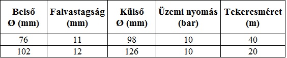 Üzemi nyomás: 10 bar. Hőállóság: -30°C/+80°C. Vákuum: 8 MVO (-0,8 bar). Kopás érték: DIN 53516 szerint 70 mm3 (belül)ill. 90-110 mm3 (kívül). Tekercsméret: 40 m.