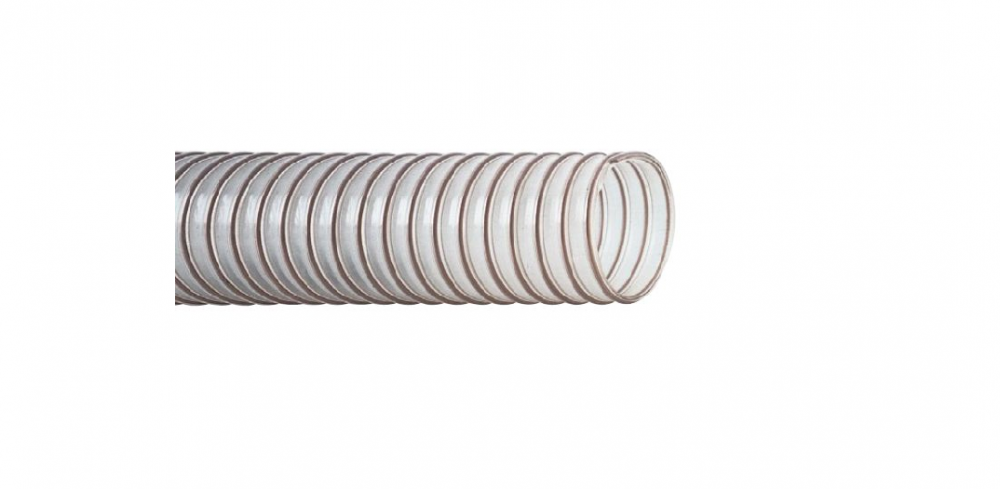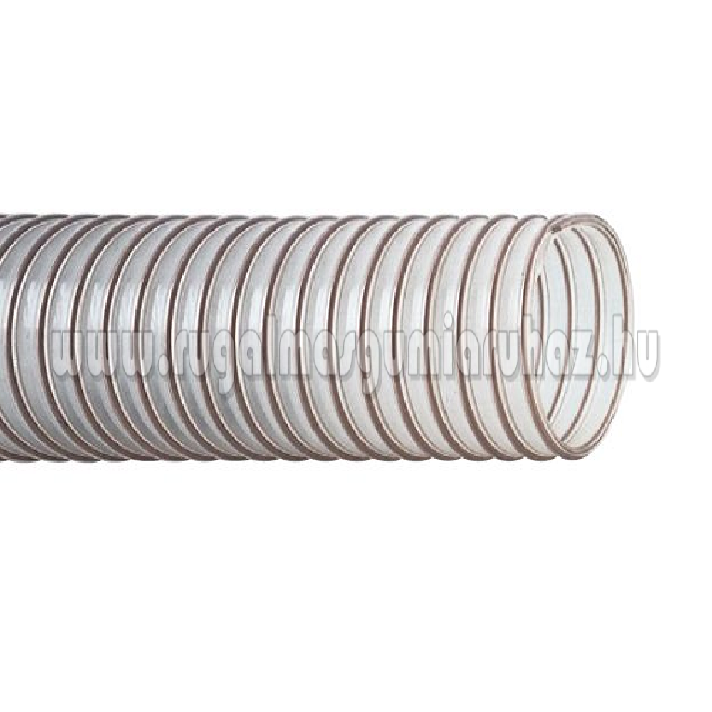 Hőállóság: -40°C/+90°Crövid ideig + 125°C. Felépítés: Poliuretán, átlátszó, beágyazott acélspirállal, belül sima, kívül hullámos. Hajlítási sugár: 1×belsõ Ø. Tekercsméret: 10 vagy 15 méter.